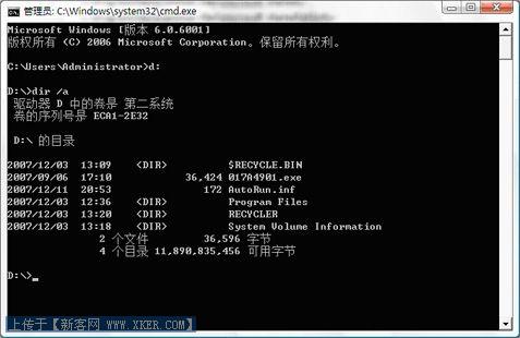 我们看到D盘内多出了Autorun.inf以及随机生成的病毒文件017a4901.exe。我们一起看看Autorun.inf的内容,输入”type autorun.inf”,Autorun.inf里的代码的意思就是当你双击打开、右键打开、资源管理器打开。都会自动运行目录里的 017A4901.exe这个文件。所以对于普通用户来说,即使你听过别人劝告,通过右键打开企图避免运行病毒也是徒劳的。因为“上有政策下有对策”,病毒也是在不断的变种升级的!当然它并不是无敌的,下文中我们就会讲述如何清理它。