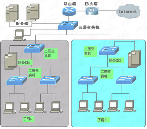 上图所示的仅是一个最基本的星形以太网架构,实际的星形企业网络比这可能要复杂许多。这复杂性不仅表现在网络设备如何高档,配置如何复杂,更重要的是表现在网络交换层次比较复杂。企业网络中的路由器和防火墙通常只需配备一个,但交换机通常不会只是一个(除了只有20个用户左右的小型网络)。如果用户数比较多,如上百个,甚至上千个,就必须依靠交换机的级联或者堆栈扩展连接了。但级联技术和堆栈技术也有所不同,它们的应用范围也不同。