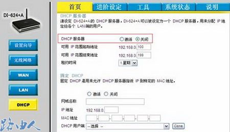 二、进入友讯DI-624+A路由器的设定界面,将DHCP服务器关闭,以免下连计算机获取到错误的IP信息