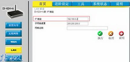 三、如果在这台友讯路由器的前端有另一台友讯路由器,并且也是D-Link品牌,请将此友讯路由器的LAN IP地址改成192.168.0.2或其他此网段的IP地址,以免与前端友讯路由器LAN IP冲突。