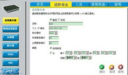二、调试宽带路由器虚拟服务器功能。 进入到路由器的“进阶设定”,然后选择“虚拟服务器”。填入Web服务器的相关参数,然后执行。虚拟服务器功能默认的设置是关闭的,需要激活此功能。