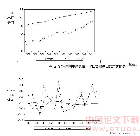 注:1.对GDP、出口和进口对数序列的ADF检验中,包含了位移项(intercept)和趋势顶(trend),因为从图1中可以看出,这二个序列都包含一定的位移和趋势,如果不考虑位移和趋势就可能产生错误的单位根判断;而对差分序列的ADF检验中,则既不包含移位顶,也不包含趋势顶,因为图2显示这二个序列都不包含位移和趋势。