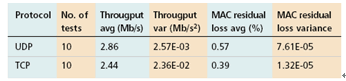 下面我们用另一种方式来评估提高目前ad hoc路由协议的适应性。从这个角度,在MT1和MT3之间放置一个中间节点,因此有两个理想信道而不是第一部分测量中的一个。我们做了10次不同的测试,并且和之前的结果做了比较,它们有着较高的稳定性,UDP的吞吐量固定在3Ms左右,TCP的吞吐量固定在2.5Ms左右,如表2所示。另外,数据包丢失可以忽略不计,而且增强了用户体验,这在基于UDP的应用中是一个至关重要的因素;而在使用TCP协议的情况下,由于在传输层采用了错误和阻塞控制机制,很好地处理了有限的包丢失的情况(通常情况下每次通信不会超过一个段),从而使性能提高了很多。这个方案不仅从性能的角度,而且从能源的角度都是有益的,因为在这种情况下传输器在任何时候都不需要执行MAC重发。这也是比其他传统扩展方案的一个优势所在。