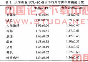 由表可见,我校大学新生在在SCL一90各因子得分与全国青年常模相比是一致的,但在强迫因子上得分较高,应给予关注。