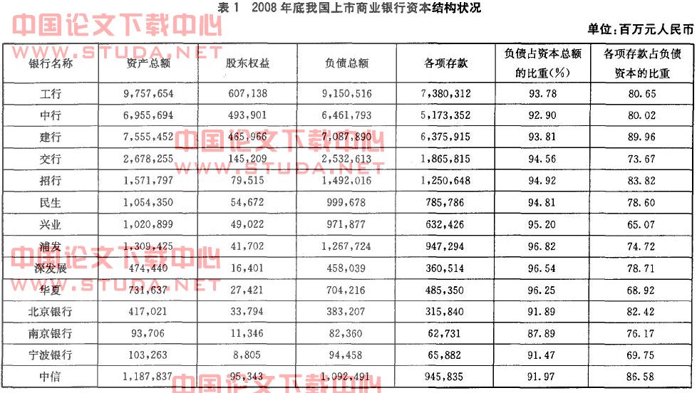 无论是国有商业银行还是股份制商业银行,各项存款都在负债资本中均占有很大比重。从表1可以看出2008年中国银行各项存款占负债资本的比重是8O.02%,工商银行是80.65%,建设银行89.96%;而股份制商业银行各项存款占负债资本的比重中,中信银行最高,达86.58%,兴业银行最低也达65.07%。这说明目前我国上市商业银行的负债资本结构比较单一。