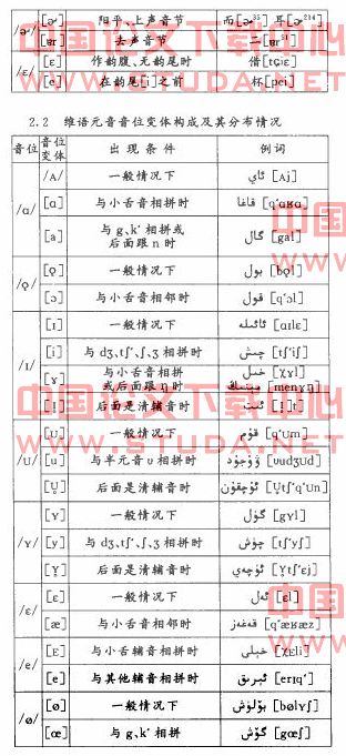 (2)汉语中/1/,/飞/,/a}/等音位在维吾尔语中没有相应的音位。维吾尔语/。/音位在汉语中没有相应的音位及其音位变体。