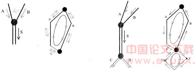 5)。环形中两条线路间不仅仅是双抱环式运行,在客流高峰期以及各自联系的支线的影响下, 又可以各自独立运行,与单线组织方式相同,且两种运行方式可以同时进行。