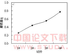 按表 2 试验参数进行滚动模拟试验,各试样的磨损量如图 5 所示。弧面接触的试样 1 磨损量小于斜面接触的试样 2、3、4。试样 1 与 2 相比,各试验参数相同,但由于接触方式 不同造成试验结果相差很大,试样 1 的磨损量仅为试样 2 的 58%。斜面接触试样由于横向力的作用,接触应力较大,因此磨损量也较大。轮轨接触应力随轴重增加而增大,因此试样2、3、4 磨损量逐渐亦随轴重增加而增大,且呈线性增长。